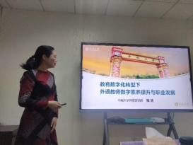 观影后,与会教师表示深受单声故事的感染和震撼,同时也体会到了电影在传播文化中的积极作用。陈洁教授以此为契机,做了一场与信息技术相关的讲座:《教育数字化转型下外语教师数字素养提升与职业发展》。陈洁用生动具体的数据和案例回顾了近些年我国教育数字化转型趋势,分享了外语教师如何顺势而为,利用数字化技术赋能语言教学的经验与体会。首先,陈洁梳理了国家教育数字化的缘起与发展。她讲到从2022年起,我国全面实施国家教育数字化战略行动,其主要目的是突破传统教育方法的局限性,积极创造数字教育新形态。其次,陈洁分享了当下主要的语言教育技术及其典型应用,她呼吁外语教师积极主动提升数字素养、建设数字化能力以适应数字教育新形态。再次,陈洁分析了第一批和第二批国家本科一流课程认定基本情况以及公司一流课程建设的现状,希望公司外语教师能以第三批国家一流本科课程申报和建设为抓手,跟上数字化外语教学的时代潮流,不断拓展自身职业发展的空间和前景。