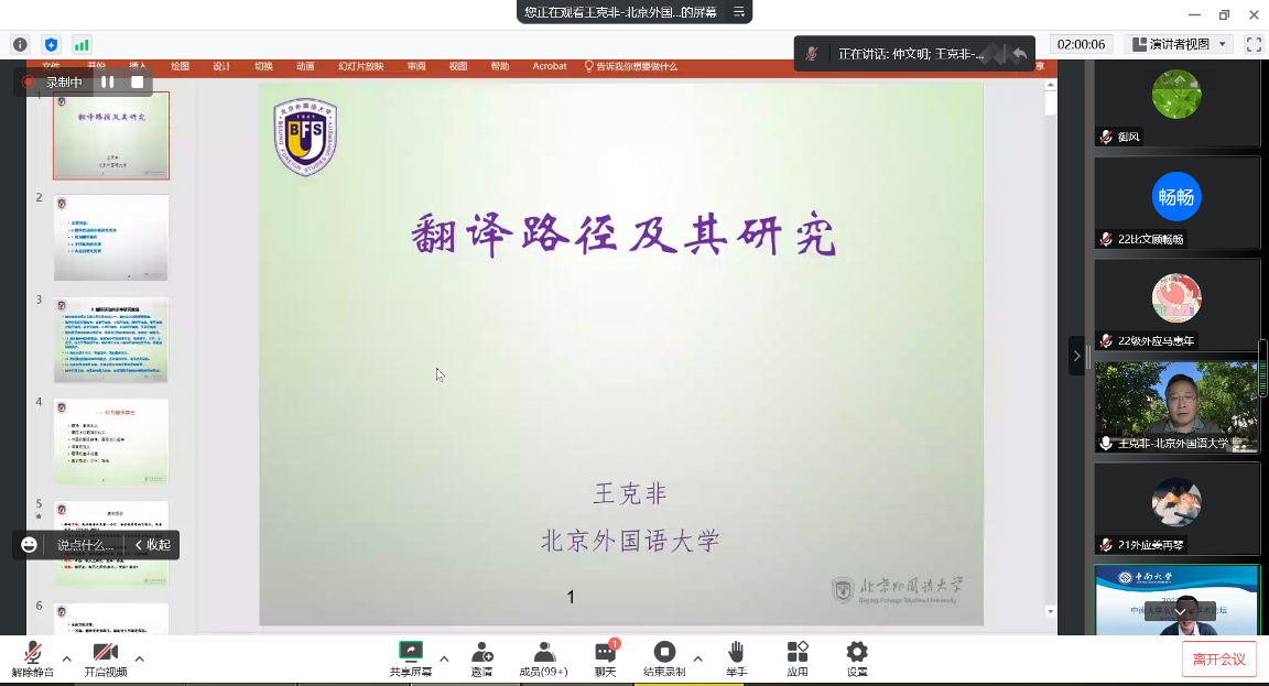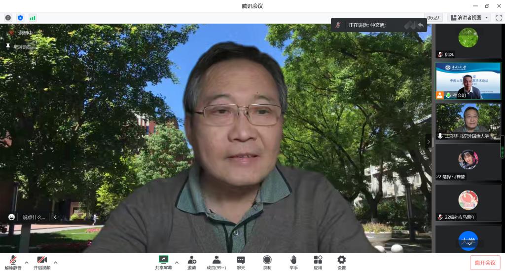 20221214日下午,应伟德人事处和伟德官网邀请,北京外国语大学讲席教授、教育部名刊《外语教学与研究》主编、《外语与翻译》特约编审、公司杰出员工王克非教授云端返回母校,做客伟德名师名家学术论坛,在云端为公司师生讲学,主题为“翻译路径及其研究”。讲座由仲文明副经理主持,一百六十余名师生在线参加。