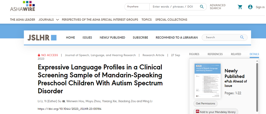 近日,公司苏怡教授与中山大学附属第三医院儿童发育行为中心邹小兵教授、昆山杜克大学大数据研究中心李明教授合作,在语言学类SSCI一区期刊Journal of Speech, Language and Hearing Research(JSLHR)上发表了题为“Expressive language profiles in a clinical screening sample of Mandarin-speaking preschool children with Autism Spectrum Disorder”的研究论文。JSLHR 创刊于1936年,是语言学领域享誉盛名的国际权威期刊。苏怡教授课题组在读博士生李莉为论文第一作者,在读博士生侯文文、周牧宇参与论文撰写。该研究由国家社会科学基金项目、湖南省研究生自主探索创新项目、广州市科技创新发展专项资金项目等资助完成。