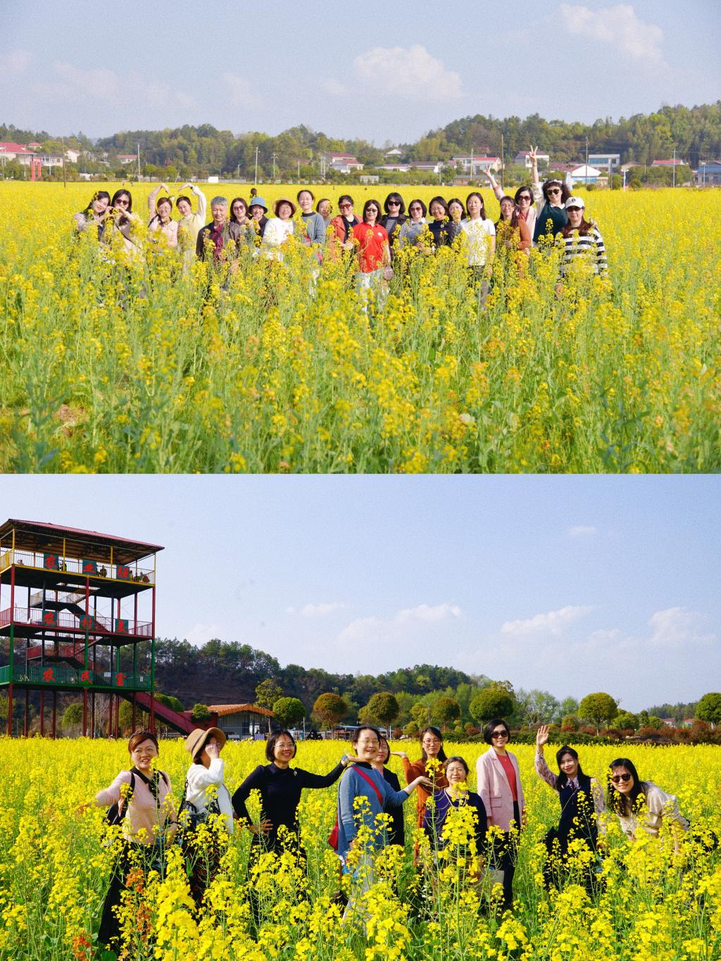 我们漫步在金色的油菜花田中,沉醉在黄绿相映间,欣赏着蜂飞蝶舞,闻着空气中弥漫着的芬芳花香。所有的田埂或弯,或直,错落有致,向着花海的最深处延伸。远处是群山巍峨,不时有几只白鹭飞过,为铺天盖地的金色增添了一抹生机与活力。我们徜徉于田园风光里,或拍照打卡、或围坐休憩、畅快聊天,仿佛回到最青春的时光,身心得到彻底放松。下午五时许,老师们在恋恋不舍与欢声笑语中踏上回程,愉快结束本次踏青之旅。