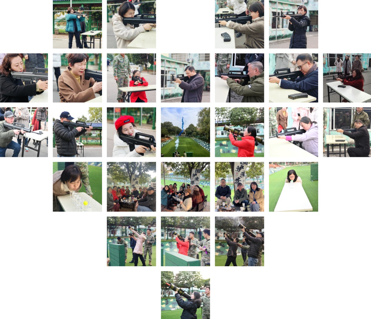 “开了一枪”之后,老师们在教官的带领下,来到另一个场地,开始“放一炮”。将高射炮置于右肩之上扛起来,左腿前屈膝,左手抬起炮膛瞄准天空上的一个假想敌,右手扣动扳机,一声尖啸,炮弹破膛而出,直上云霄!其实发射的是彩带,绚丽的彩雾弥漫在空中,如同老师们绚烂的心情。