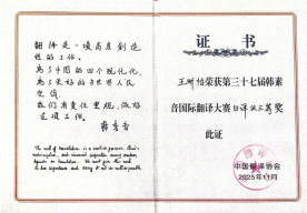 2025年11月22日,第三十七届韩素音国际翻译大赛颁奖典礼在北京举行。日语2301班王昕怡同学荣获日译汉组别三等奖,并参加了颁奖典礼。