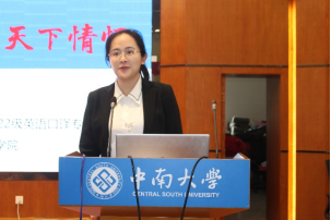 2022级口译专业研究生殷玥以《语通中外,情牵四海——外语学子的天下情怀》为题,从“站在聚光灯下、走进实践之中、投身行业前沿”三方面讲述了外语学子在服务国家、服务社会发展过程中的担当与作为。展示了外语学子立足当下、面向未来、用语言架起中外沟通的桥梁,在中外交流的道路上留下的青春足迹。路小彦、郎旺凯、赵立坚、曹余辉、徐子龙、李晓萱、王晓楠、李天夫等为代表的外语院员工的事迹深深激励着在座师生。