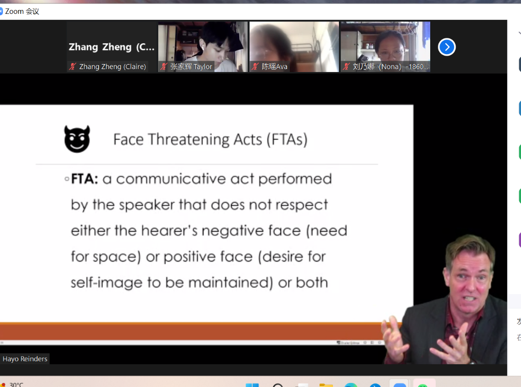 2022年9月9日8:00时,经院校审批与前期积极准备,研究生国际课程——外国语言学及应用语言学专业22级研究生的语用学正式拉开帷幕。本课程由我院张征博士与Hayo Reinders博士共同讲授,以线上+线下的混合模式呈现,碰撞出新的教学火花。