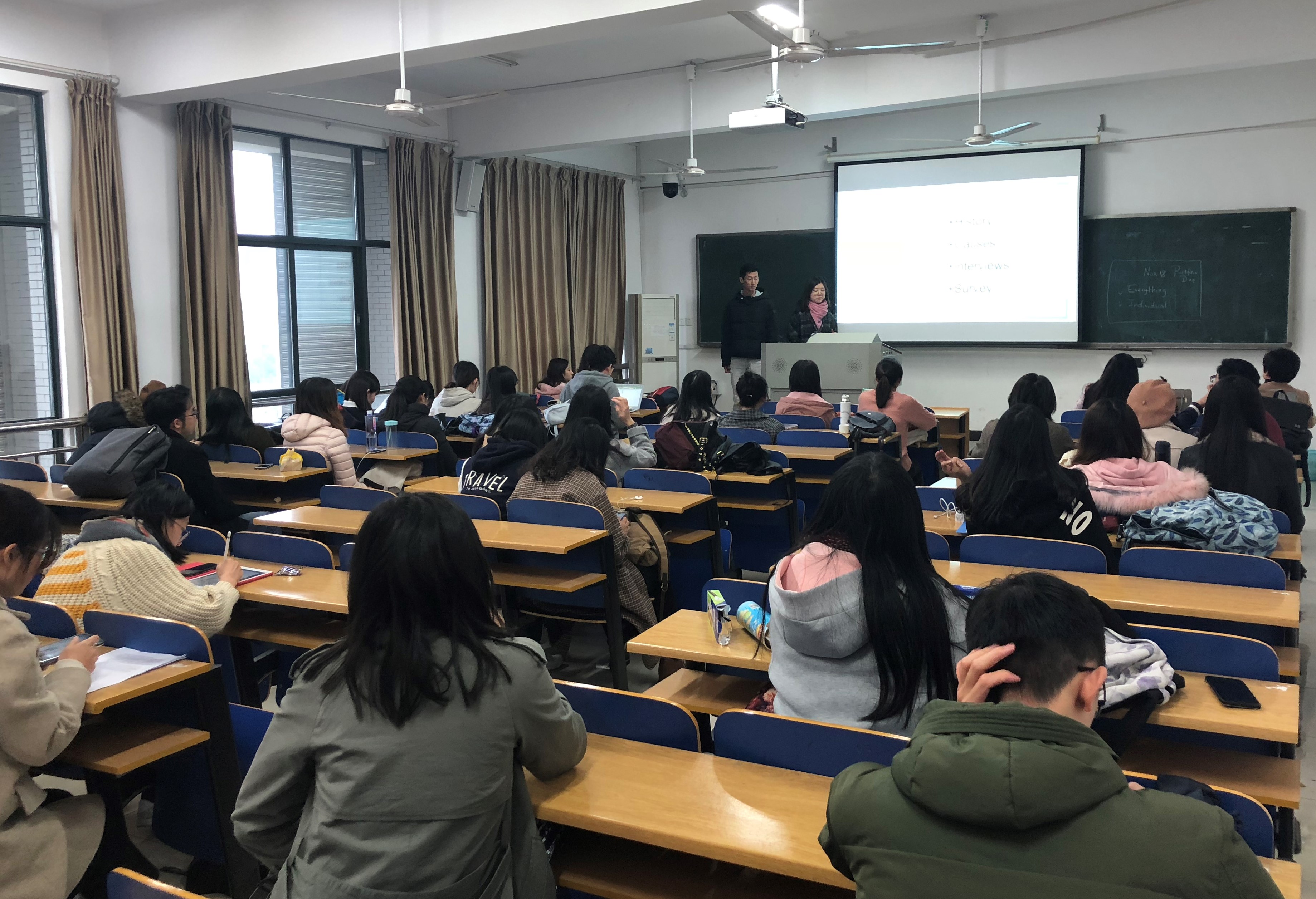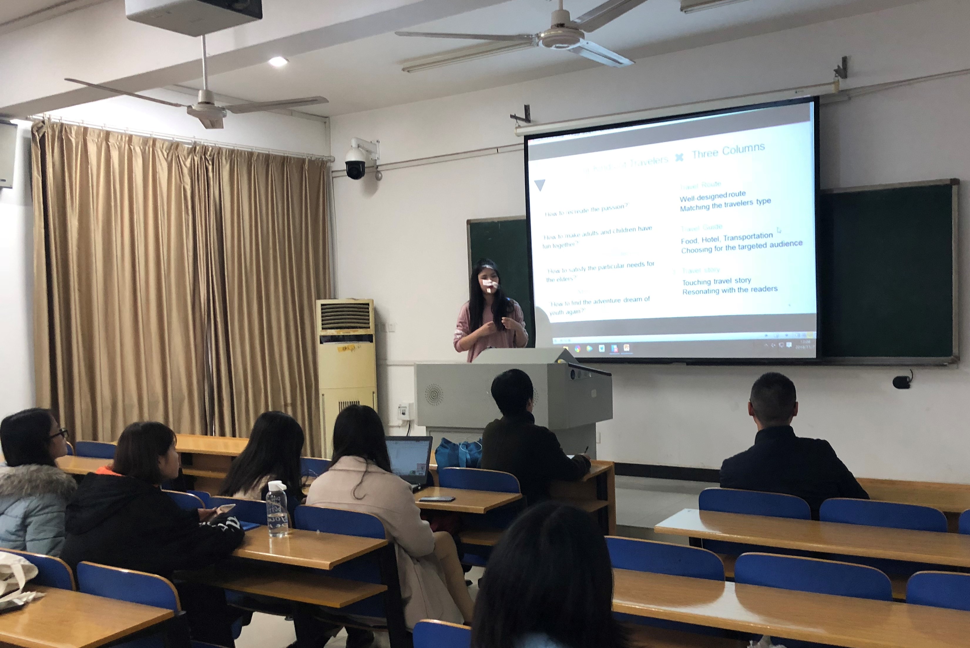 2016级英语系5个班共20个代表队,运用课程中所学到的新媒体知识,分析社会热点,深度挖掘社会问题,全英文进行课题研究,创建并运营了属于自己的微信公众号。在大赛中,同学们上台展示实践成果,制作静心,独树一帜,研究深入,剖析问题颇有见地。有的讲述了自己对英语专业员工发展前景的探寻,有的用独特新颖的眼光看中西文化的交汇融合,有的带领我们赴往一场美食的邀约。同学们展示毕,评委老师们对大家的研究成果表示了鼓励与肯定,并提出恳切的建议。