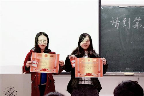 最后,英语1701班的李珺瑜和英语1703何润昕获得此次比赛的冠军。来自英语1603班的张崇蔚和方秀芸、英语1703班的王帅和法语1701班的付晓获得亚军。英语1503的钟鑫及肖赵杰、日语1701的陈晴和廖俊慧以及英语1604的赵芳霞和孙智航获得本次比赛的三等奖,伟德官网团委学会主席杨昊炜同学为获奖队伍颁奖。