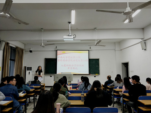 11月11日上午9:00,伟德党校第三十五期暨伟德官网分校第十期入党积极分子培训班开学典礼在外语楼602教室进行,出席典礼的有外语公司党委陈广程书记,班导师李雅丽老师。三十七名入党积极分子参加了此次典礼。