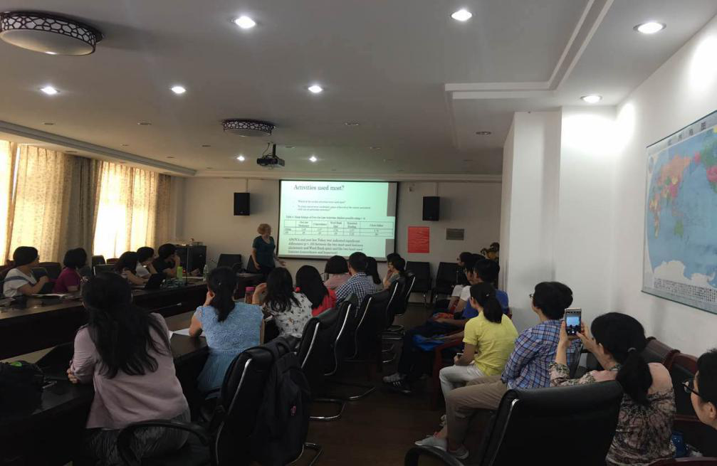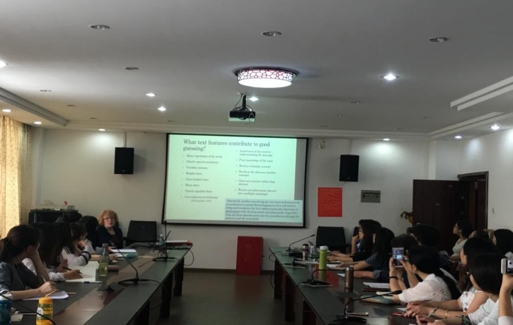 6月2日的讲座主题为Teaching and Explaining Academic Vocabulary. Dr. Horst 侧重于讲解显性词汇教学,并强调要基于情景来教授以及解释词汇,通过句子的结构、词汇的词根等方法来猜测词意。Dr. Horst 将图片、文字以及游戏相结合使得讲座充满趣味性同时也拉近了彼此之间的距离。