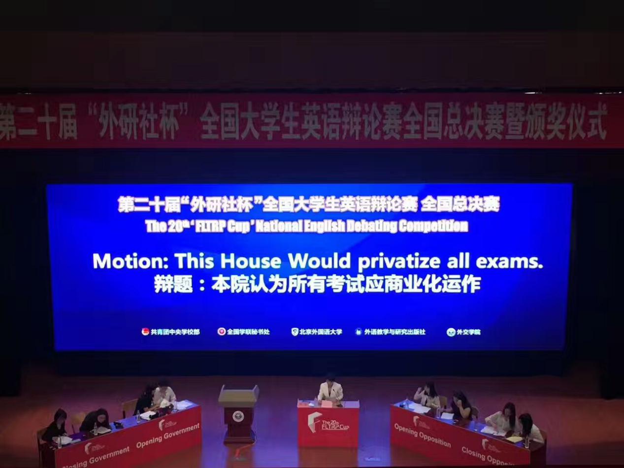“外研社杯”全国英语辩论赛创始于1997年,是目前国内规模最大、水平最高的英语口语辩论赛事。比赛由团中央公司部、全国学联秘书处、北京外国语大学主办,外语教学与研究出版社承办,中国教育电视台、中国国际广播电台、英语学习杂志社协办。在今年的比赛中,清华大学、北京大学、中国人民大学、复旦大学、北京外国语大学、上海外国语大学、浙江大学、北京航空航天大学、上海财经大学、中央财经大学等全国120支知名高校代表队进入全国总决赛。