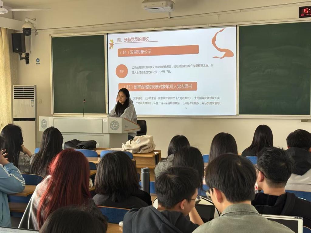 王韵涵系统阐释党员发展规范,依照“申请入党—入党积极分子的确定和培养—发展对象的确定和考察—预备党员的接收—预备党员的教育考察和转正”五阶段时间轴,详细讲述了27个关键节点的标准要求,并针对基层实务中存在的典型问题强调了相关工作规范:一是严格把控培养教育时效性,明确入党积极分子须在党校结业证书五年有效期内完成组织发展程序,逾期需重新参加理论培训及考核;二是强化支委会前置审议机制,在团组织推优、讨论发展对象、接收预备党员等关键环节,必须形成包含时间、地点、表决结果等要素的完整会议纪要;三是注重发展材料时序逻辑审查,重点核查团员团龄需满一年,才可以推优成为入党积极分子、入党积极分子培养考察期满一年才可以参加发展对象推优、预备党员转正间隔精确至一年等时间节点。她强调,发展对象须切实履行材料填报主体责任,支部书记及委员严格审查,确保全流程可追溯、无疏漏。