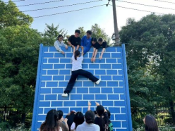 在“众志成城墙”环节中,面对高达四米的“毕业墙”,全体党员需在不借助任何工具的情况下,依靠团队力量全员翻越。活动中,同志们迅速分工协作:一部分同志甘为“人梯”,用肩膀托起同伴;一部分同志在上方奋力护航,确保每位成员安全登顶;其余同志则严密守护,提供安全保障。整个过程中,指令清晰,行动高效,同志们相互鼓励打气的加油声不绝于耳。最终,全体成员挑战成功。党员同志们感慨道,面对困难任务,同志们不能轻言放弃、要敢于担当责任,勇于直面矛盾,互相团结实现共同目标。