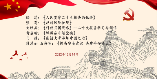 张莉老师以《应对风险挑战》为题,讲解了我国目前在国内、国际上面临的风险挑战,提出我们必须丢掉一切幻想,坚持底线思维,做好应对最坏情况的准备。必须团结起来,贯彻群众路线,发挥亿万人民的创造力,形成同心共圆中国梦的强大合力。尤其是广大青年,更是要听党话,跟党走,在深刻领会二十大精神的基础上,怀抱梦想,脚踏实地,投入到全面建设社会主义现代化国家的火热实践中去。