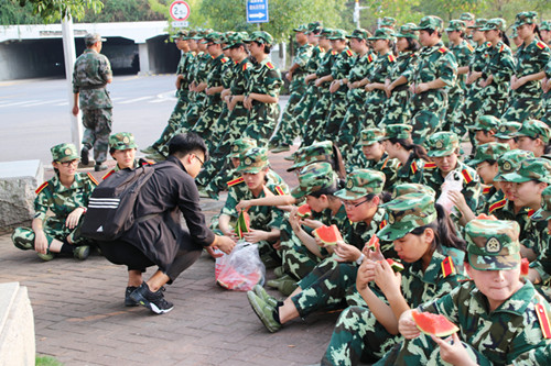当然,最令人感到温暖的是我们外院美丽的小姐姐们和帅气的小哥哥们,他们虽然会调皮地叫我们“绿青蛙”,会为我们种太阳,但他们还是冒着酷暑为我们送来清凉的西瓜和水,为外院学姐学长疯狂打call!