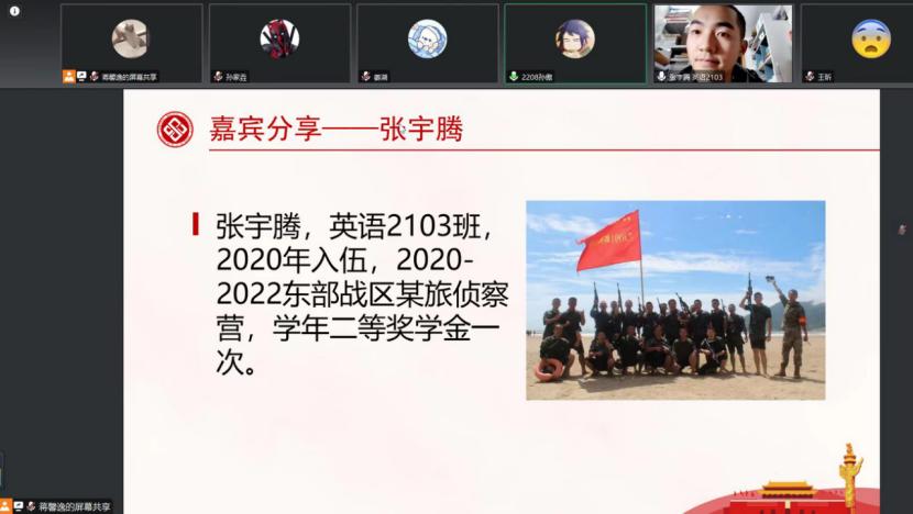 随后,20年入伍、22年退伍的英语2103班张宇腾同学和19年入伍、21年退伍的英语2103班孙家垚同学先后分享了自己选择参军入伍的心路历程和军旅收获,并鼓励同学们积极踊跃报名参军体检,“勇于迈出第一步”是两位退伍士兵对同学们的共同劝勉。