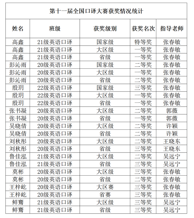 4月7日,第十一届全国口译大赛总决赛于线上落幕,公司口译方向研究生高鑫获得大赛全国特等奖(季军)、彭沁雨获得全国二等奖、殷玥获得全国三等奖,张书凝、吴晓倩、刘秋彤、鲁佳泓获得大区级二等奖,莫彬、王梓屹、鲜鶱获得大区级三等奖,指导老师吴远宁教授、张春敏教授、郭薇副教授、许颖副教授、王晓东副教授获得“优秀指导老师”奖。