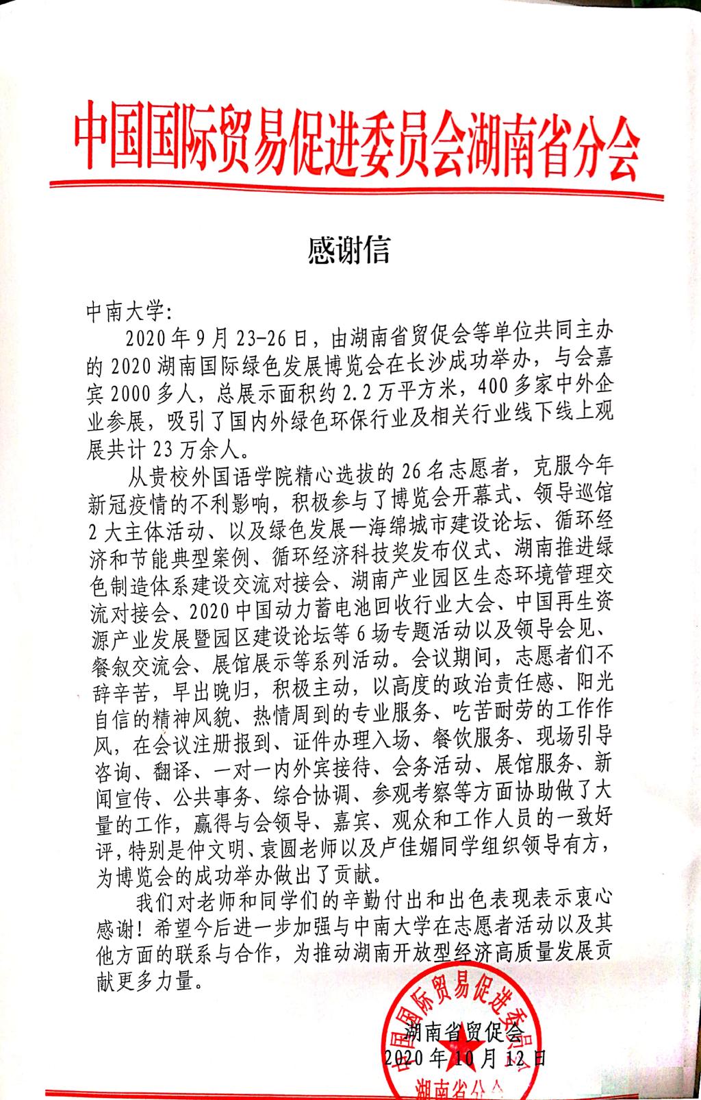 绿博会感谢信