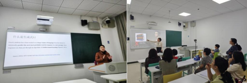 2024年11月13日,大外中心第三教研室组织教师们参加教发中心定制的“AI赋能课堂教学的探索与实践”专题讲座,并在会后开展了“生成式AI助力大学英语教师专业成长”专题研讨。教师们围绕生成式AI在大学英语教学中的应用及提升教师专业能力等方面展开深入交流,主要探讨了人工智能丰富教学资源、创新教学理念的多种可能以及利用技术设计个性化教学方案、提升教学效率等具体实施路径。与会教师们达成共识,应积极主动探索AI在教学中的多元应用,持续提升信息素养与教学能力,以科学合理的方式将其融入教学流程,为员工塑造更优质、高效且个性化的学习体验,为教育数字化革新持续赋能,全方位助力大学英语教学革新与发展。