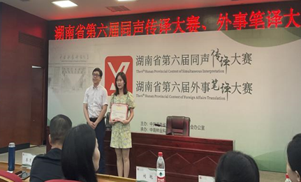 在5月28日举办的湖南省第六届同声传译暨外事笔译大赛中,公司西班牙语专业员工任真获笔译特等奖(第一名),杨叶怡获二等奖(第六名),孙纯获三等奖(指导老师方丽君)。