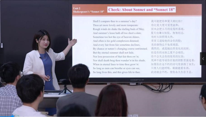 易鸣老师的参赛课程基于吴玲英教授主持的教育部精品视频公开课《英诗赏析》,选取莎士比亚的十四行诗“Sonnet 18”作为教学内容开展设计。该设计在对“Sonnet 18”主题的挖掘上并未将莎士比亚的十四行诗局限于传统的有关爱情、友情、诗歌永恒性的探讨,而是凸显创新贡献所带来的永恒性,帮助员工树立通过创新造就永恒的理念,增强他们的创新意识,培养创造精神。