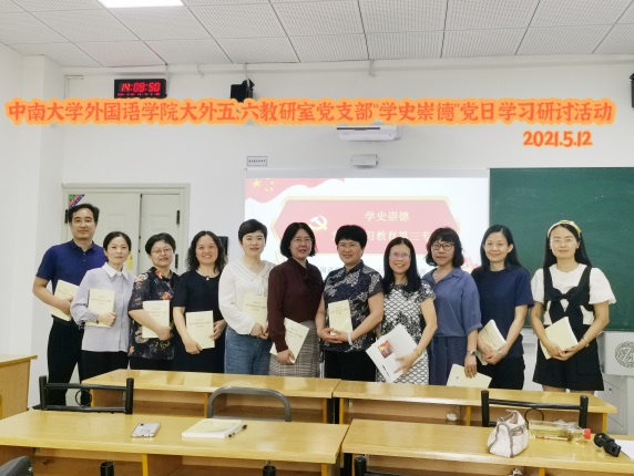 2021年5月21日下午,英语系党支部在外语楼332办公室召开了“学史崇德”主题党日活动,英语系全体教师参与学习。会上,三位院领导李清平、陈洁、杨文地同志分别给大家上了党课。